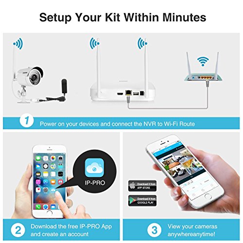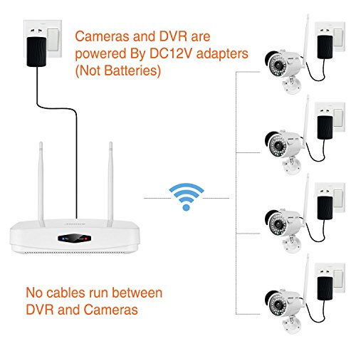 -. Feature : ★ 4CH 1080P wireless NVR with 1080P HD indoor and outdoor WIFI cameras providing around-the-clock protection for your property. Stylish and compact design for smaller size NVR. / ★ Wireless freedom, no need to run cables all over the wall. Automatic paring, no complicated settings. Real plug and play system brings you peace of mind. / ★ Strong WIFI penetration. You can strengthen the connection between the cameras and NVR by using the coming WIFI antenna or set one of the camera as a repeater. / ★ Easy P2P remote monitoring on smart phone, tablet and computer. Free app for Android and iOS devices. Smart and instant motion-triggered email alert. / ★ CE, FCC&HDMI certified products with qualified power adapters. Red IP66 weatherproof cameras with 100ft/30m crystal clear night vision.