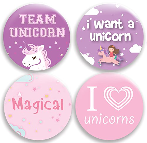 Binding : Apparel Product Description Four LARGE 2.25" (58mm) unicorn-themed buttons/pins/badges. You will receive FOUR buttons to help spread the coolness of unicorns. Perfect gift for: parties, workplaces, hospitals, school bags, office functions, winter coats, sweaters, workplace flair, public demonstrations and everything in between. Especially great if you'd like it to be known that you're a proud supporter of unicorns! 0