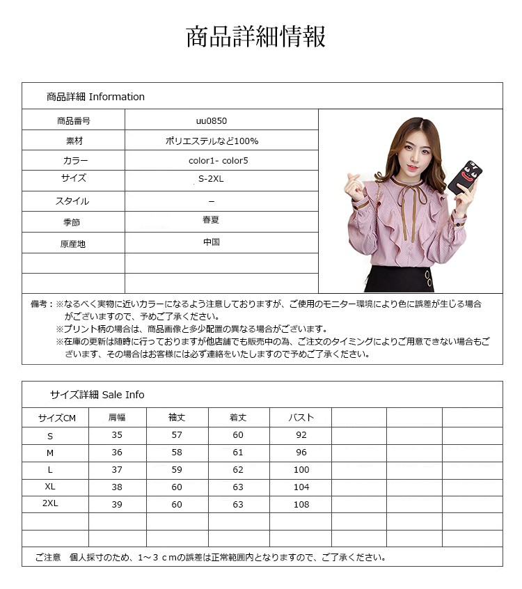 ■素材:ポリエステルなど100%■カラー:color1--color5■サイズ:S袖丈57着丈60バスト92肩幅35M袖丈58着丈61バスト96肩幅36L袖丈59着丈62バスト100肩幅37XL袖丈60着丈63バスト104肩幅382XL袖丈60着丈63バスト108肩幅39■原産地:中国
