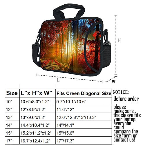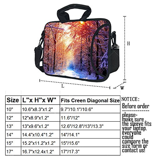 -. Binding : Personal Computers -. Brand : Wondertify -. Feature : Designed by a simple and fashion way to protect your MacBook, Laptop, Notebook Ultrabook computer or iPad. / Made of 100% neoprene, Lightweight,Durable and water resistant. / High quality printing on both side of the bag. / Slim and lightweight design allows you to carry the case by itself or in a bag. / There have seven sizes to choose: 10 inch, 11 inch,12 inch,13-14 inch, and 15 inch,17 inch -. Label : Wondertify -. Manufacturer : Wondertify -. Model : IO-P1896 -. MPN : IO-P1896 -. PartNumber : IO-P1896 -. ProductGroup : PC Accessory -. ProductTypeName : CARRYING_CASE_OR_BAG -. Publisher : Wondertify -. Size : 10-10.1 Inch -. Studio : Wondertify -. Title : Wondertify 10-10.1 Inch Waterproof Neoprene Laptop Shoulder Bag Briefcase - Snow Forest Protective Bag Carrying Case for iPad Air/iPad Pro/iPad mini 2/3/4/Surface RT/Pro 2