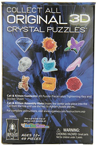 Tease your brain and delight your eyes with this innovative Cat and Kitten 3D crystal puzzle. The uniquely-shaped, plastic interlocking pieces combine to make a lovely decoration for any room. But don't be fooled! These puzzles are harder than they seem! When you've joined the interlocking plastic pieces together (be ready for a challenge), its glossy, sleek design will impress all who see it. BePuzzled is more than just jigsaw puzzles. It's puzzle-plus. WARNING: Do not order this product from retailers that ship from outside of the U.S. or Canada as it is most likely a poor quality, counterfeit product. 0 |