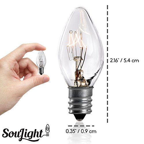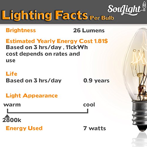 The SouLight 7 Watt Replacement Bulbs (10 2 Pack) each have a C7 shape and a candelabra base. These light bulbs provide a soft, warm white light and provide the perfect light for accent and display lighting as well as general lighting in a variety of applications. Keep your lamps glowing with SouLight Replacement Bulbs. Details: ? - 12 pack of 7 Watt C7 bulbs
