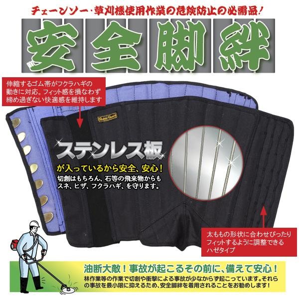 ステンレス板(厚み0.6mm)とフェルトが入っており、草刈り機やチェーンソー等を使用した作業の危険防止に最適です!!馳止め式なので足首にフィットし、作業中も外れにくい!!石などの飛来物からスネ、ヒザ、フクラハギを守ります。 |