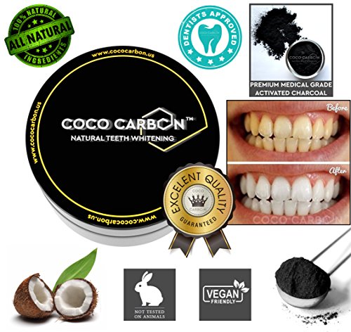 - PREMIUM INGREDIENTS: All natural and carefully selected organic ingredients to help detoxify your mouth and teeth, and leave it feeling clean. - SPECIAL FORMULA MADE FROM COCONUTS: A 100% PURE Special Premium Activated Coconut Charcoal Formula that's Anti-Bacterial, Anti-Fungal and Great for Gum Health and Sensitive Teeth. It also removes all stains including those from food, smoking and drinking (tea, wine, coffee). - IT LASTS FOR MONTHS - Recommended to use x2 times a day, for 21 days - Refreshes Your Breath - Prevents Bad Breath - Removes Bacterial Plaque - Prevents Harmful Bacteria Growth - Can also be used if wearing braces - Our activated charcoal is 100% Safe, Adsorbs Toxins and Chemicals - All COCO CARBON TM products come sealed - Safe for everyday use (RDA Index rating of 69) Instructions: Slightly moisten the toothbrush, shake off the excess water firmly, dip it into the special activated charcoal tooth whitening powder by only slightly touching it. Only use what got attached to the slightly moisten toothbrush. Gently brush your teeth in small Circles for 3 minutes, try your best to keep your lips closed while brushing, and try to avoid brushing the gums, spit it out carefully and rinse really well. For best results brush x2 times/day using coco carbon TM. Only by using our perfectly formulated premium activated charcoal COCO CARBON TM tooth whitening product x2 times a day for 21 days can you expect safe, lasting results without going through any of the pain, sensitivities or risks associated with other tooth whitener products. Afterwards, use as needed. 0