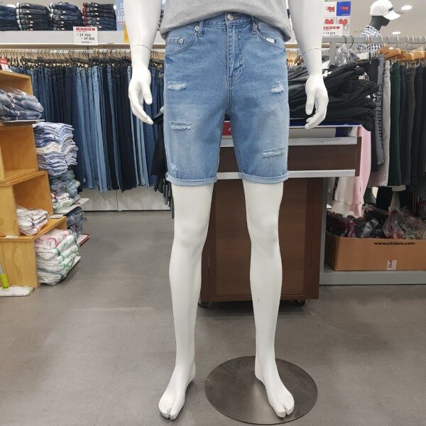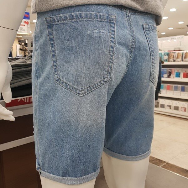 남성용 라이트블루 5부 데님입니다^^기본 심플한 디자인의 시원한 라이트블루 워싱이 돋보이는 스타일입니다.과하지않은 찢어짐과 스판은 없지만 여유있는 통으로 나와서 활동성이 편하고 데일리로 착용하기 좋습니다.밑단은 커팅 포인트가 되어 있어 내려서 입으시거나 롤업해서 연출하셔도 예쁩니다.