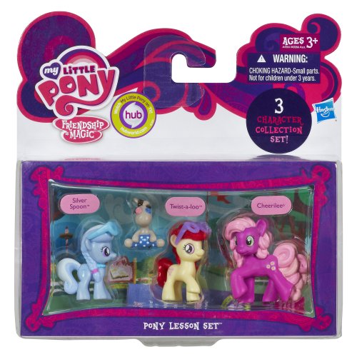 -. Binding : Toy -. Brand : My Little Pony -. Color : Multi-Color -. Department : Girls -. EAN : 0653569848424 -. Feature : Pony Lesson Set includes 3 figures / Cheerilee figure is a teacher pony / Silver Spoon and Twist-a-loo figures are student ponies / Includes 3 figures -. IsAdultProduct : 0 -. Label : My Little Pony -. Manufacturer : My Little Pony -. Model : A4361722 -. MPN : A43617220 -. PackageQuantity : 1 -. PartNumber : A43617220 -. ProductGroup : Toy -. ProductTypeName : TOYS_AND_GAMES -. Publisher : My Little Pony -. Size : 3" H -. Studio : My Little Pony -. Title : My Little Pony, Pony Lesson Set (Silver Spoon, Twist-a-loo, and Cheerilee), 3-Pack -. UPC : 433599359004 -. Warranty : No Warranty