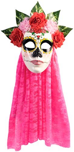 -. Feature : Day of the dead senora deluxe mask with elastic band / Floral design with light and dark pink roses and pink lace veil / One size fits most adults / Great for dia de los muertos celebrations, parades, Mardi Gras, Halloween, and more / Made by Forum Novelties, a company with decades of experience offering costumes, accessories, and fun novelty products for all occasions, fabric is not applicable