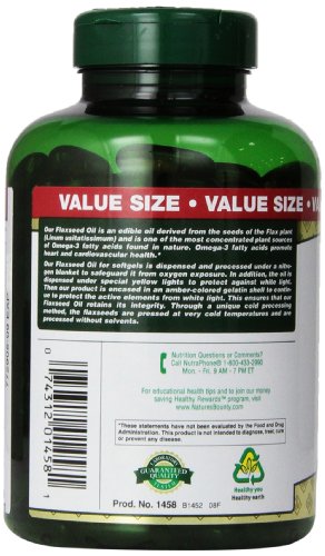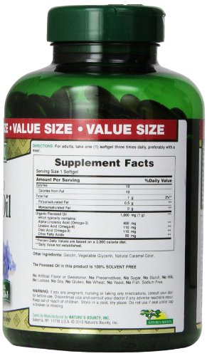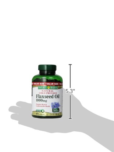 -. Binding : Health and Beauty -. Brand : Nature's Bounty -. EAN : 5000174502206 -. Feature : One of the best vegetarian sources of Omega-3s found in nature. / Contribute to heart health.* / Supports skin health.* / 100% solvent free. / *These statements have not been evaluated by the Food and Drug Administration. This product is not intended to diagnose, treat, cure or prevent any disease. / Promotes heart and cardiovascular health / Natural cold pressed / Rapid release liquid soft gel / Contains natural Omega-3 / Dietary supplement -. IsAdultProduct : 0 -. Label : Nature's Bounty -. LegalDisclaimer : IN NO EVENT, REGARDLESS OF CAUSE, SHALL ALL STAR SALES BE LIABLE FOR ANY INDIRECT, SPECIAL, INCIDENTAL, PUNITIVE OR CONSEQUENTIAL DAMAGES OF ANY KIND, WHETHER ARISING UNDER BREACH OF CONTRACT, TORT (INCLUDING NEGLIGENCE), STRICT LIABILITY OR OTHERWISE, AND WHETHER BASED ON THIS AGREEMENT OR OTHERWISE, EVEN IF ADVISED OF THE POSSIBILITY OF SUCH DAMAGES. ALL STARS SALES HOLDS NO LIABILITY FOR ANY DAMAGES OR PROBLEMS FROM USE OF ANY PRODUCTS SOLD, AS WE ARE A THIRD PARTY SELLER. ALL PRODUCTS MUST BE USED AS DIRECTED AND AT YOUR OWN RISK OF RESPONSIBILITY. -. Manufacturer : Nature's Bounty -. Model : NATURES996488 -. MPN : 996488 -. NumberOfItems : 1 -. PackageQuantity : 1 -. PartNumber : 996488 -. ProductGroup : Health and Beauty -. ProductTypeName : HEALTH_PERSONAL_CARE -. Publisher : Nature's Bounty -. Studio : Nature's Bounty -. Title : Nature's Bounty Flaxseed Oil 1000mg, 200 Softgels -. UPC : 074312014581