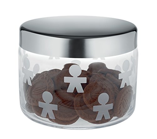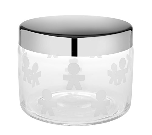ALESSI "GIROTONDO" COOKIE JAR IN SILK-SCREEN GLASS WITH LID IN 18/10 STAINLESS STEEL MIRROR POLISHED, SILVER