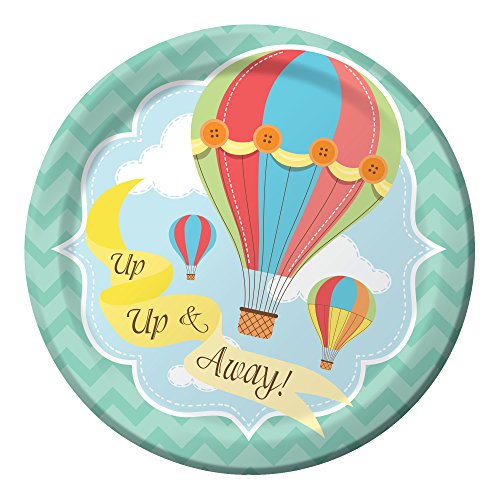 -. Feature : 8-Count package of premium strength paper lunch plates / 7-Inches in diameter / Made in the USA / Charming, colorful hot air balloons in a blue sky with puffy clouds; each plate reads Up, Up and Away! / Look for Up, Up and Away tableware, party supplies, decorations and coordinating Touch of Color solids Coral and Mimosa