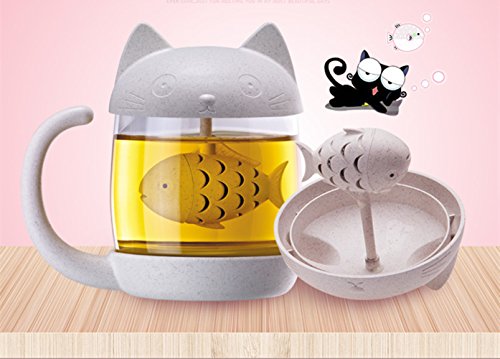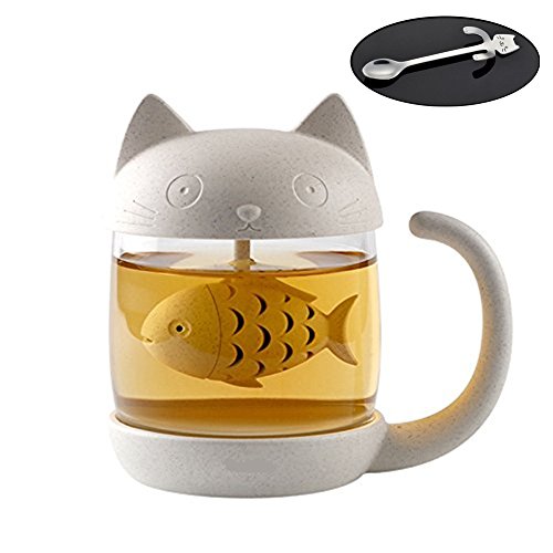 -. Feature : The whole cup is made of Wheat Straw and high borosilicate glass. Valley Fiber inside wheat straw is environment friendly, Non-toxic, safe, healthy material and it will naturaly decompose without any Toxic Chemicals after abandon. When you get it, you will love the smell of natural grain. Glass can bear -20℃-200℃, Durable heat anti-burst and explosion proof. / Its a present for cat lovers, this unique mug design is perfect for friends, family, and you. / "The filtration system uses very fine holes to allow only water into the cup, holding on to your tea leaves and preventing you from drinking scented tea with leaf debris. " / You can open the fish filter from the small gap between fish head and body, then make tea small and set in. The Cup lid is not screwed, so we suggest you drink your hot tea in 30min. / We will send you a kitten spoon