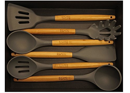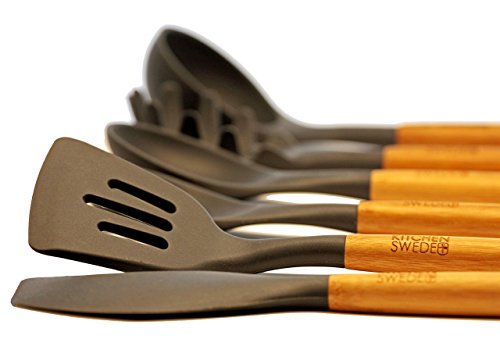 - KITCHENSWEDE 6 KITCHEN UTENSILS SET: A Spatula, Soup Ladle, Cooking Spoon, Slotted Spoon, Slotted Turner and a Pasta Server made of Bamboo and Silicone. The utensils is 12 1/2 inches long.