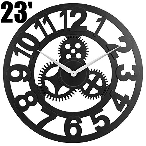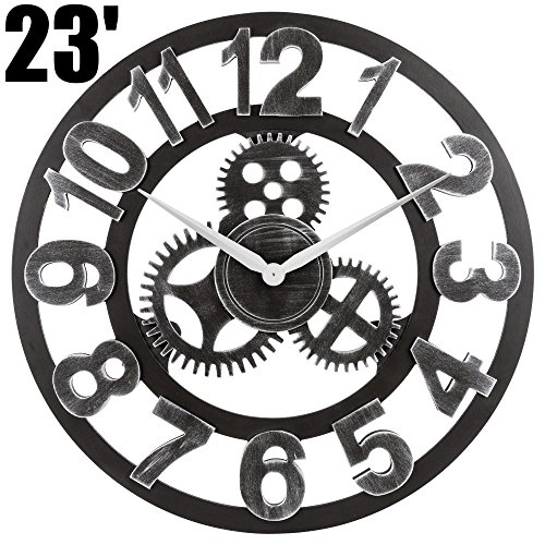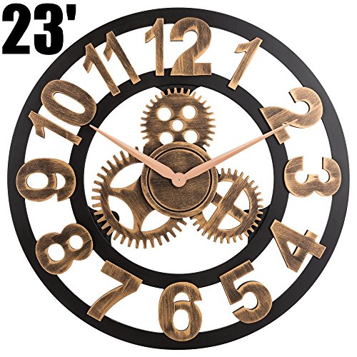 This high quality silent completely noiseless quatz gear clock is handmade wooden wall art. It is a great décor solution for anyone who appreciates an rustic look and feel. The rugged design of oversized, stationary gears were made of hand painted wood. Its hand painted finish is done in aged metallic tones. Requires 1 AA battery (not included). Dimensions include: 23" diameter, 0.55" thick. This one-of-a-kind item gear wall art clock approximately weighs 3 pounds. Only quality materials and manufacturing will do. Product materials: zero noise non-ticking high quality quartz movement, engineered wooden fiberboard, metal (hands). No assembly required - hands fully assembled.Feature
