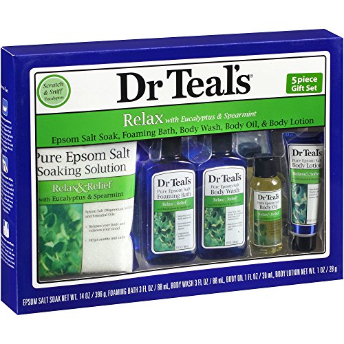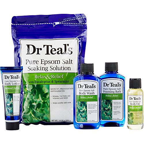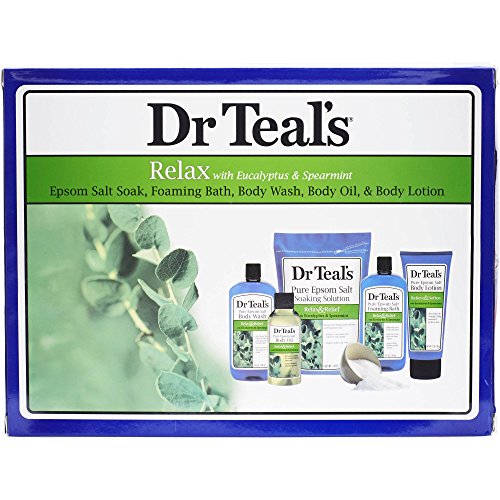 -. Binding : Misc. -. Brand : Dr Teal's -. Color : Relax with Eucalyptus & Spearmint 5-Piece -. EAN : 0811068014706 -. Feature : Contains: 14 oz Pure Epsom Salt Soaking Solution; 3 fl oz Pure Epsom Salt Foaming Bath; 3 fl. oz Body Wash; 1 fl oz Pure Epsom Salt Body Oil; 1 oz Pure Epsom Salt Body Lotion / Relaxes your body and relieves your mind / Helps relax and calm / Nourishes your skin and your senses / Long-lasting bubbles gently cleanse -. IsAdultProduct : 0 -. Label : pdc brands -. Manufacturer : pdc brands -. Model : 16151 -. MPN : 16151 -. PackageQuantity : 1 -. PartNumber : 16151 -. ProductGroup : Beauty -. ProductTypeName : BEAUTY -. Publisher : pdc brands -. Studio : pdc brands -. Title : Dr Teal's Relax with Eucalyptus & Spearmint 5-Piece Bath Travel Gift Set -. UPC : 811068014706