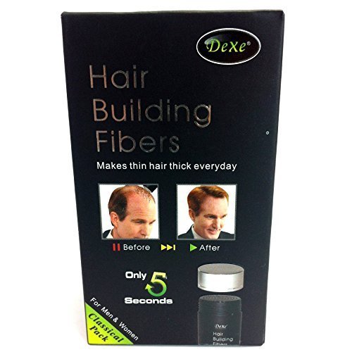 -. Binding : Health and Beauty -. Feature : Makes thinning hair look thick and full in 30 seconds! / Step1 : Apply Hair Building Fibers over thinning areas / Step 2 : Pat the Hair Building Fibers into Your Hair / Step 3: (Optional) Hair Locking Spray -. IsAdultProduct : 0 -. Label : Dexe -. Manufacturer : Dexe -. PackageQuantity : 100 -. ProductGroup : Beauty -. ProductTypeName : HEALTH_PERSONAL_CARE -. Publisher : Dexe -. Studio : Dexe -. Title : Dexe Hair Builder Fibers - Cotton Fiber Makes Hair Thick for a Day- Easy Quick Application - Amazing Temporary Hair Loss Treatment Without the Use of Wigs or Harsh Transplant Surgery- For Both Men and Women - Natural Plant Fibers Mimic Human Hair - Makes Thin Hair Very Thick - A Growth Substitute Safe for Everyday Use (black)