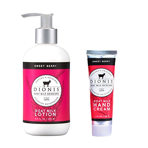 - Two item set that includes one 8.5 oz Goat Milk Body Lotion and one 1 oz tube of Goat Milk Hand Cream in "Sweet Berry" scent.