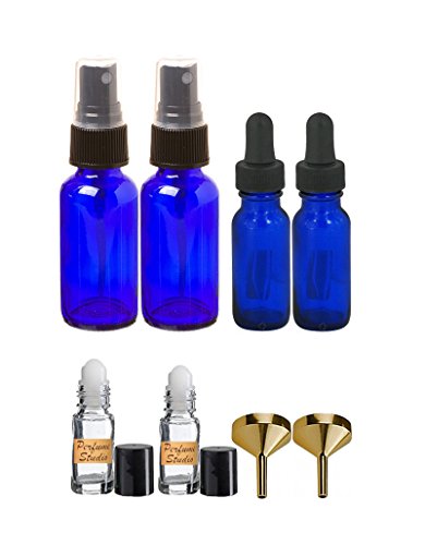 -. Title : Essential Oil Bottle Set: Includes (2) 1oz Cobalt Spray Bottles, (2) 15ml Cobalt Glass Droppers, (2) Perfume Funnels, and (2) 5ml Clear Glass Roller bottles