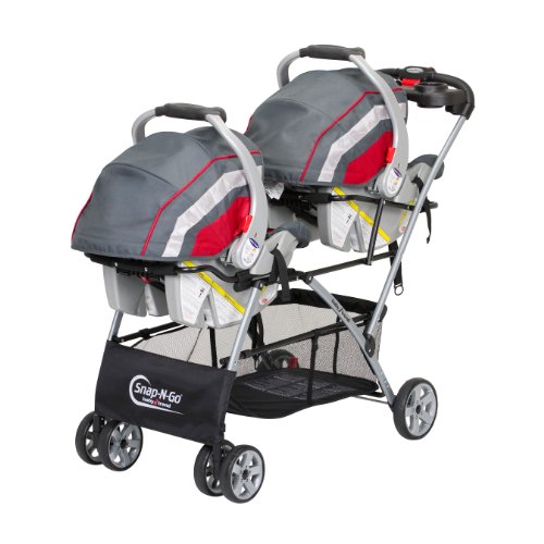 The new Baby Trend Universal Double Snap-N-Go accepts 2 infant car seats and with a larger frame that acts like a cradle for a better fit for car seats. Allows adult to place 2 infant car seats onto carriage frame without removing your children from the car seat arranged in stadium seating. A 2-cup holder parent tray with covered storage compartment makes this a lightweight and easy to transport choice for parents on the go. This stroller has a convenient one hand fold, and comes with a large drop down storage basket. For stability, this stroller features rear wheels with brakes.