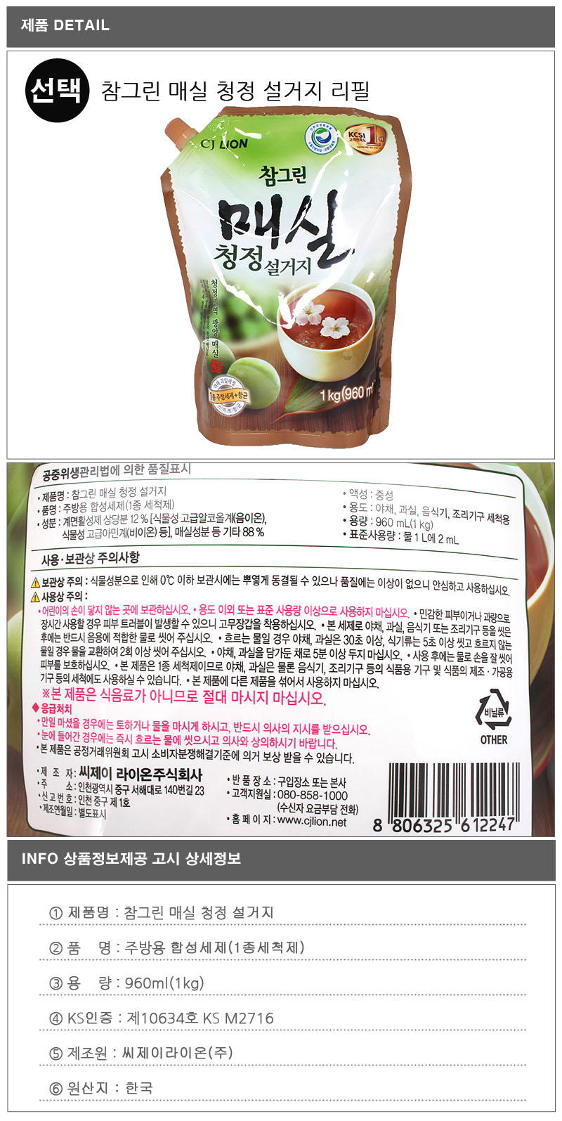 - 품명 및 모델명참그린 매실 청정 설거지 리필 1kg 3개
