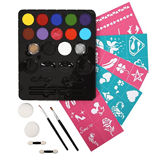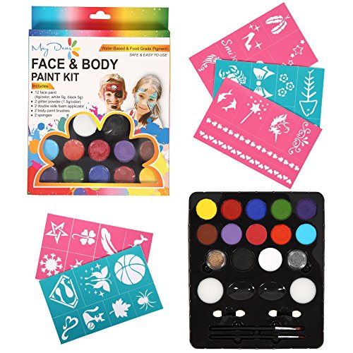 Maydear Face Paint Kit for Kids with Safe and None Toxic FDA Compliant Water Based 12 Color Palette (X-Large) with 30 Stencils, 2 Brushes and 2 Sponges