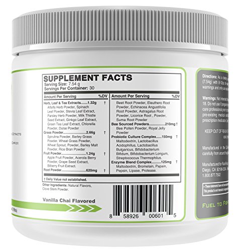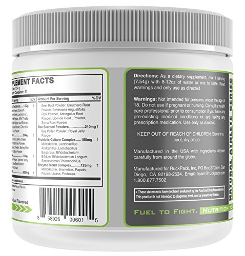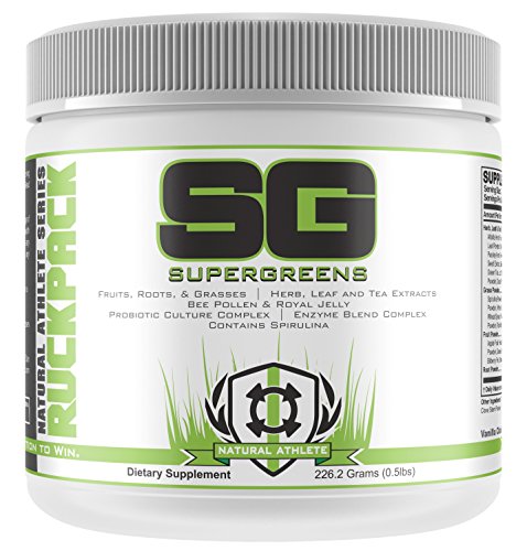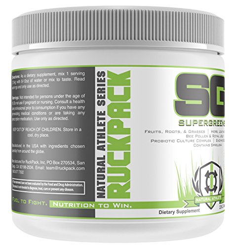 Optimal Performance. Time to start performing your best? Then it's time you start fueling your body right. This is the foundation to health and sports performance. And don't worry, this isn't the veggie blend you turned your nose to as a kid, either. This is a great tasting blend of the best super foods available. One of the largest benefits of consuming supergreens is that they are high in phytonutrients. Phytonutrients are nutrients from plants that are necessary for sustaining human life and preventing disease. They can boost the immune system, increase natural energy, improve focus and clarity, and detoxify the body. RuckPack Supergreens also contain a comprehensive blend of digestive enzymes and probiotic cultures that can significantly enhance digestion and decrease the strain on your digestive organs. One of the largest benefits of consuming supergreens is that they are high in phytonutrients. Phytonutrients are nutrients from plants that are necessary for sustaining human life and preventing disease. They can boost the immune system, increase natural energy, improve focus and clarity, and detoxify the body. RuckPack's Natural Athlete Series Super Greens, Vanilla Chai flavored, .5lbs--- 226gs. Super Greens contains: Spirulina Powder, Probiotic Culture Complex, Enzyme Blend Complex, Ginkgo Leaf Extract, Green Tea Leaf Extract, Spinach Leaf Powder, Beet Root Powder, Wheat Grass Powder, & more..Feature