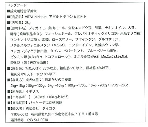 原材料:ジャガイモ、鶏肉ミール、全粒エンドウ豆、甜菜、チキンオイル、人参、酵母(発酵製品由来)、フィッシュミール、プレバイオティックオリゴ糖(果糖オリゴ糖、マンナンオリゴ糖)、海藻、ローズマリー、サヤインゲン、グルコサミン、メチルスルフォニルメタン(MSM)、コンドロイチン、乾燥ホウレン草、ユッカシディゲラ抽出物、タイム、ペパーミント、ブルーベリー抽出物、ビタミン類(A,D3,E(α-トコフェロール))、ミネラル類(Fe,Zn,Mn,Cu,Ca,l,Se,Na)、酸化防止剤(天然物由来)