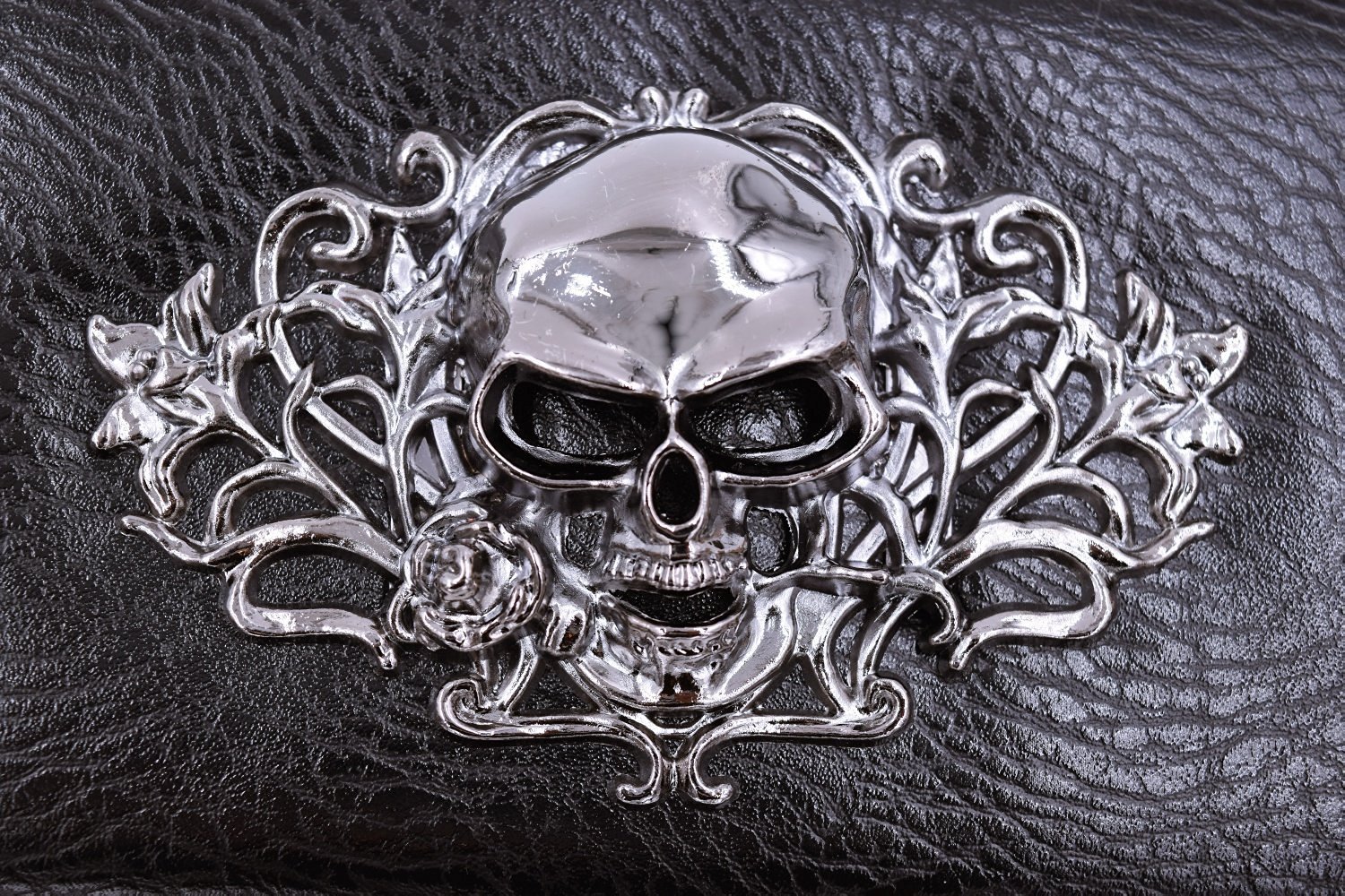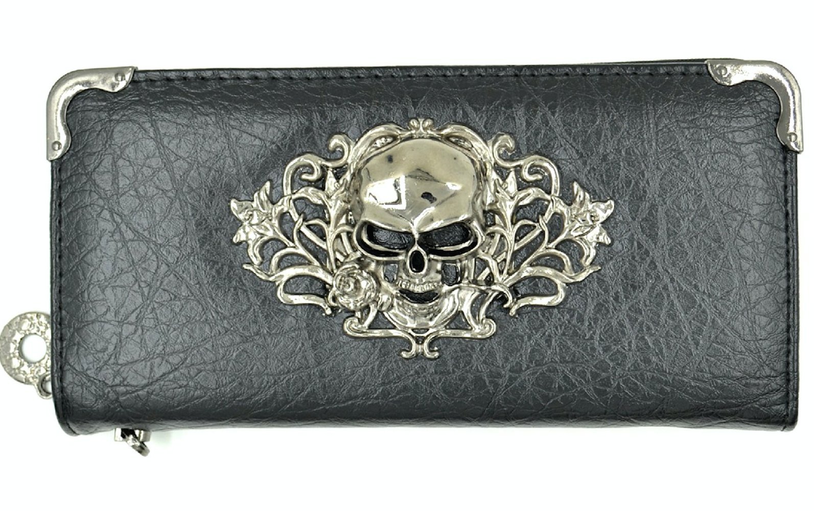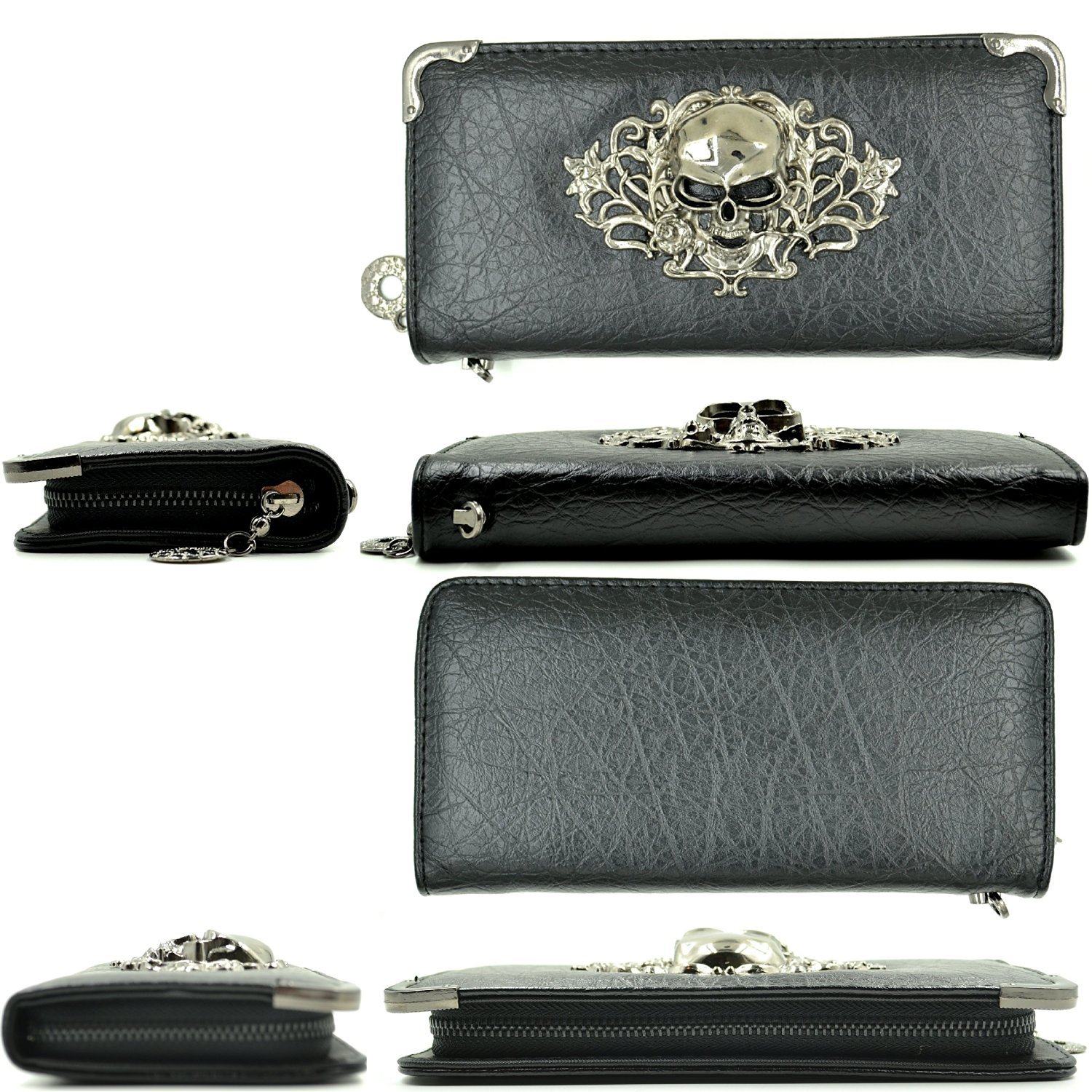It is a round zipper long wallet with a 3D skull metal plate.