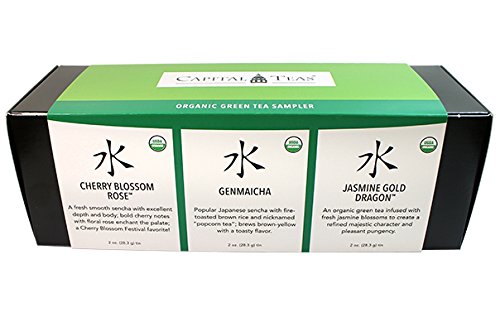 -. Binding : Misc. -. Brand : Capital Teas -. Feature : Try organic green tea three ways to find the source of antioxidants that best fits your tastes / Medium caffeine levels are ideal for both morning and afternoon brews / Sample all three green teas iced to develop a new appreciation for the flavors -. IsAdultProduct : 0 -. Label : Capital Teas -. Manufacturer : Capital Teas -. PackageQuantity : 1 -. ProductGroup : Grocery -. ProductTypeName : GROCERY -. Publisher : Capital Teas -. Size : 3 oz -. Studio : Capital Teas -. Title : Capital Teas Organic Green Tea Loose Leaf Tea Sampler