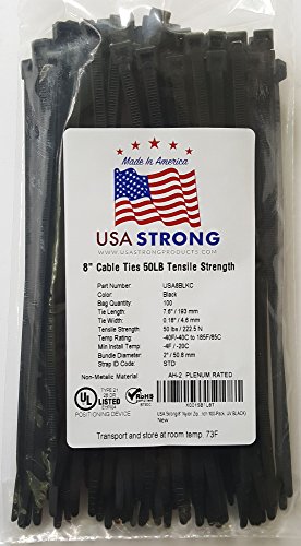 USA Strong Cable Ties. Pliable 50 LB Tensile Strength UV RESISTANT nylon self-locking wire management zips | 100 Pack | MADE IN THE USA! (8 Inch, UV Black)