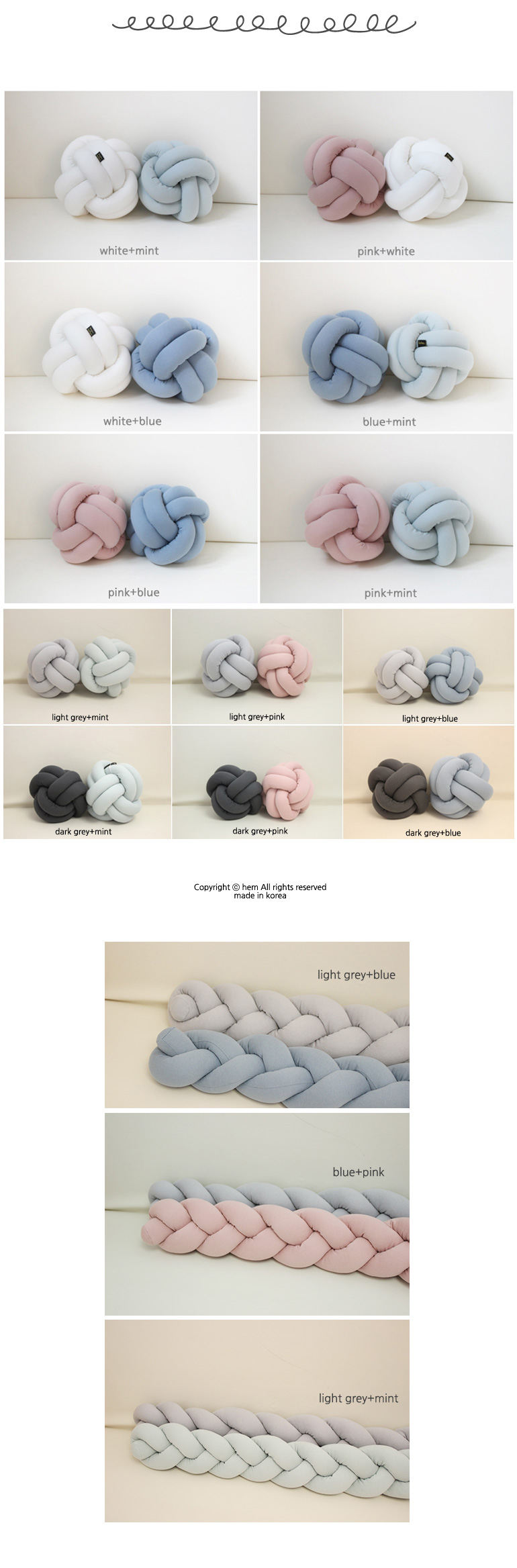긴 원통형 쿠션을 가드쿠션이나 방석, 또는 다양한 매듭으로 변형해서 사용하는 제품입니다.