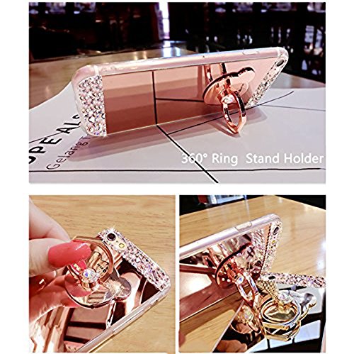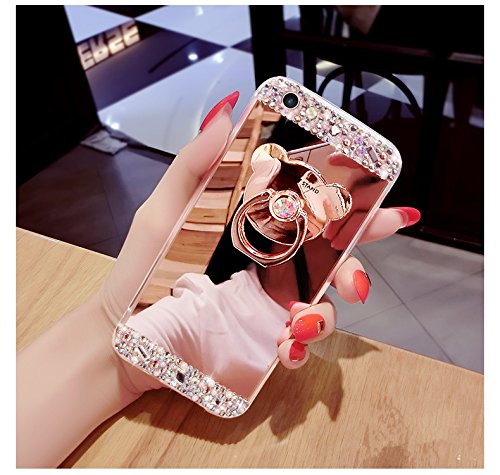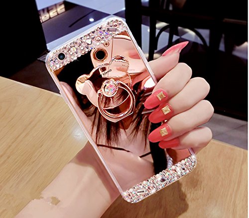 For Samsung Galaxy S6 Edge Plus Case [Mirror Case], PHEZEN Beauty Luxury Diamond Hybrid Glitter Bling Soft TPU Rubber Shiny Sparkling Mirror Back Case Cover with Bear Ring Stand, (Rose Gold)