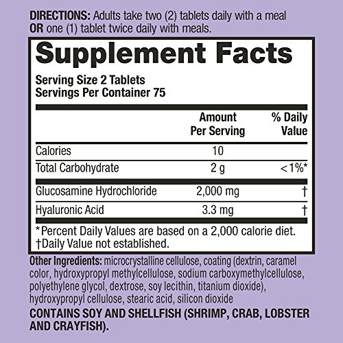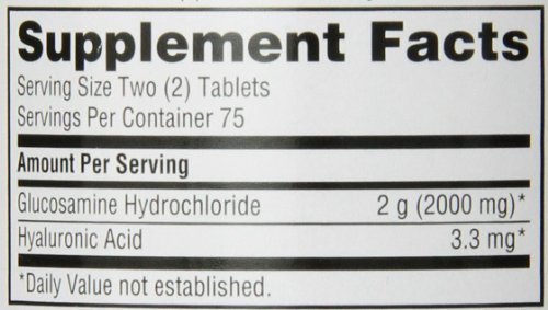 2 coated tablets provides 2000mg of Glucosamine and 3.3mg of Hyaluronic Acid
