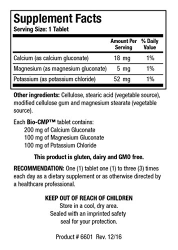 Dosage: One (1) tablet one (1) to three (3) times each day as a dietary supplement or as otherwise directed by a healthcare professional. Active Ingredients:Calcium (as calcium gluconate), Magnesium (as magnesium gluconate), and Potassium (potassium chloride). Each Bio-CMPTM tablet contains: 200 mg of Calcium Gluconate, 100 mg of Magnesium Gluconate and 100 mg of Potassium Chloride. Other Ingredients:Cellulose, stearic acid (vegetable source), modified cellulose gum and magnesium stearate (vegetable source).