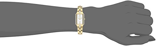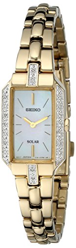 Dress watch, Solar-powered movement, Overcharging prevention feature, Polished gold-tone hands, Applied polished gold-tone baton markers at twelve and six o'clock, Gold-tone indices, White mother-of-pearl dial with black logo, Polished gold-tone stainless steel bracelet with adjustable links and push-button-clasp, Polished gold-tone stainless steel octagonal case encrusted with 18 genuine diamonds, Polished gold-tone steel crown, Stainless steel caseback, Hardlex crystal, 3 ATM (30 meters/100 feet water resistant)Feature