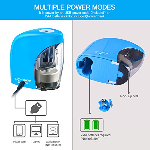 【Multiple Power Sources】: The Pencil Sharpener can be powered by either an usb power cord (Included) or 2 AA batteries (Not Included), which will make the shaving be more portable and convenient. Pay attention! The sharpener will not come with batteries.