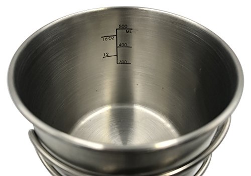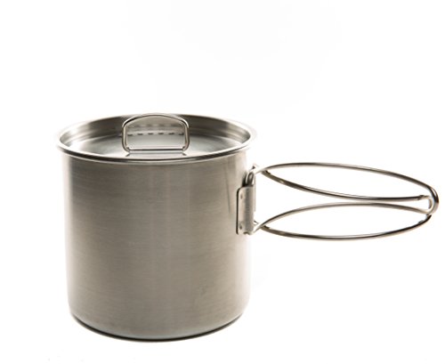 ESSENTIAL GEAR: "bombproof" stainless steel mug for hiking, backpacking and camping, this weighs 6.8 oz total and measures 3.5" tall and 3.75" wide with a flat bottom. With its lid, the cup becomes a small functional cooking pot. The folding handle makes it compact for storing in a backpack, water pouch or bug-out bag yet allows the handles to extend away from flames when cooking.