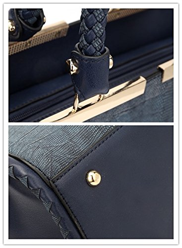 - CHIC & FASHION:Structured two tone design, snake skin with smooth vegan leather winged. 4"woven stronger top handles with gold tone top decorative accents.
