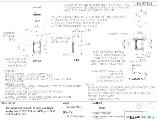 BUD Industries Series SNB Steel NEMA 4 Sheet Metal Box with Mounting Bracket, 5-29/32" Width x 7-55/64" Height x 5-29/32" Depth, Smooth Gray Finish