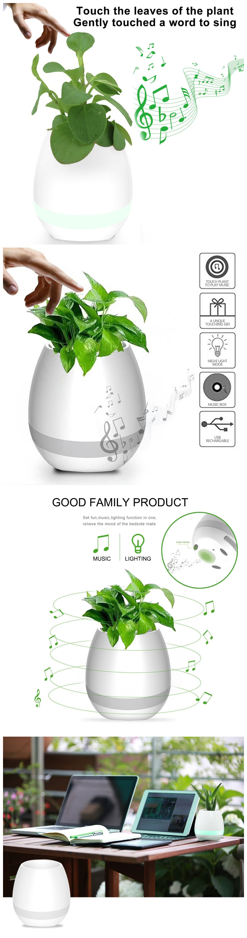 It is a creative flowerpot full of vitality with Exclusive Innovation Function. Through the embedded sensors of the soil, the plant on this flowerpot can feel your touch of the plant and return you the lively music u0026amp; warm light.Specification: