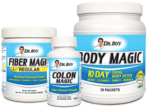 -. Binding : Health and Beauty -. Brand : Dr. Bo's -. EAN : 0641022974636 -. Feature : Nutritional Cleansing Fiber Medical professionals tell us that the majority of today's health problems originate in the colon. Fast food, highly refined and processed foods, low fiber diets, white flour, excessive sugar, preservatives and artificial coloring are all suspected enemies. No health program can be fully effective until the body is cleansed of excess toxic material, which is often built up, layer upon layer, over a period of many years. / Organic Cleansing Herbs A clogged colon interferes with the absorption and digestion of food, depriving the body of necessary nutrients. This results in fermentation and putrefaction of undigested food which creates poisons. These poisons are reabsorbed into the bloodstream affecting every organ and part of the body. We age prematurely, we look and feel old, our joints become stiff and painful, our eyes become dull and a slish brain overtakes us - the pleasure of living is gone!! / Dr. Bo's Magic Pak is the most complete and superior Total Body Detox and Cleanse package available to date. The first step to achieving Dr. Bo's 20 ForeverTM lifestyle. Magic Pak not only provides numerous detoxification and rejuvenation qualities but also the ultimate in nutritional cleansing helping to clean, feed, stimulate and rebuild the colon and to establish three to four good bowel movements daily. So, start your Magic Pak today and LET THE MAGIC BEGIN! -. Label : Dr. Bo's -. Manufacturer : Dr. Bo's -. ProductGroup : Health and Beauty -. ProductTypeName : HEALTH_PERSONAL_CARE -. Publisher : Dr. Bo's -. Studio : Dr. Bo's -. Title : Dr. Bo's Magic Pak 10 Day Total Body Detox 30 Day Colon Cleanse Program -. UPC : 641022974636