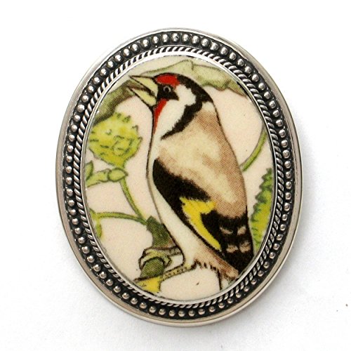 -. Title : Broken China Jewelry Wedgwood Garden Birds European Goldfinch Bird Sterling Pin Brooch
