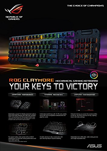 -. AspectRatio : Unknown -. Binding : Personal Computers -. Brand : Asus -. Color : Cherry MX Red -. EAN : 0889349475263 -. Feature : ASUS Aura ROG Sync for a customizable light-show with the growing ASUS Aura ecosystem including mouse, motherboard and graphics card via ROG Armoury's 14 lighting effects / Cherry MX RGB switches for faster response times and extended keyboard life cycle / Detachable numeric keypad attaches to left for macros or right for 10-key usage / One-click overclocking, profile-switching, boot-up and fan control through programmed hot keys / Aluminum-alloy frame for enhanced durability and keypad stability -. HardwarePlatform : pc -. Label : ASUS Computer International Direct -. Manufacturer : ASUS Computer International Direct -. Model : ROG Claymore Cherry MX Red -. MPN : ROG Claymore Cherry MX Red -. NumberOfItems : 1 -. PackageQuantity : 1 -. PartNumber : ROG Claymore Cherry MX Red -. ProductGroup : Personal Computer -. ProductTypeName : COMPUTER_INPUT_DEVICE -. Publisher : ASUS Computer International Direct -. Studio : ASUS Computer International Direct -. Title : ASUS ROG Claymore Cherry MX Red Mechanical Gaming Keyboard -. UPC : 889349475263 -. Warranty : 1 Year Warranty