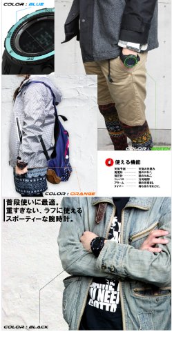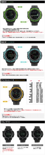 ■性能 ・ドイツ製センサー搭載 ・天気予測機能 ・高度計 ・温度計 ・気圧計 ・30m防水 ・アラーム ・クロノグラフ ・ラップタイム測定 ・カウントダウンタイマー ・デジタルコンパス ・デュアルタイム(第二都市時間表示)