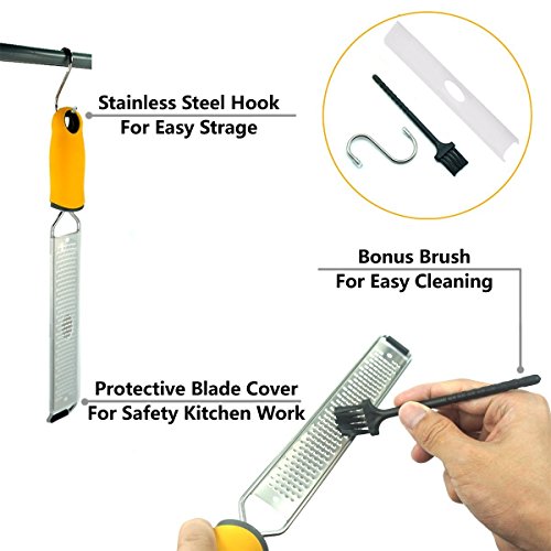 - ❤ COMFORTABLE & SAFE ★Non-slip ergonomic soft grip handle for better control, this ensures its accuracy and efficiency. And it`s absolutely dishwasher safe. The Protect Cover ensures zester is completely safety when not in use. The Stainless Steel S Hook make it possible for you to hang it up wherever you like.