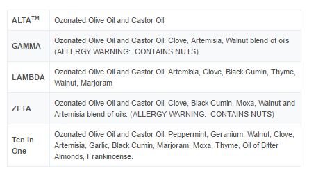 - Ozonated Olive Oil and Castor Oil; Artemisia, Clove, Black Cumin, Thyme, Walnut, Marjoram