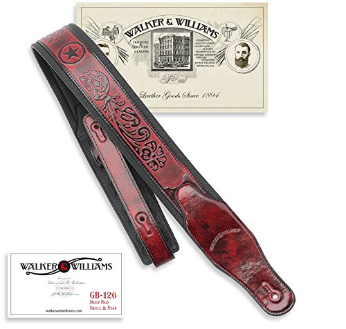 -. Brand : Walker & Williams -. Color : Black -. EAN : 0736024417110 -. Feature : Premium Quality Handmade Strap For Acoustic or Electric Guitar or Bass / Black Cherry Top Welt with Texas Star & Skulls Design / Ultra Comfortable Padded Black Glove Leather Back / Double Reinforced End Caps & Matching Top Stitching / 2.75" Wide and Adjustable From 41"-54" -. Label : Walker & Williams -. Manufacturer : Walker & Williams -. Model : WW-GB-126 -. MPN : WW-GB-126 -. PackageQuantity : 1 -. PartNumber : WW-GB-126 -. ProductGroup : Musical Instruments -. ProductTypeName : INSTRUMENT_PARTS_AND_ACCESSORIES -. Publisher : Walker & Williams -. Studio : Walker & Williams -. Title : Walker & Williams GB-126 Black Cherry Padded Guitar Strap Texas Stars & Skulls -. UPC : 736024417110