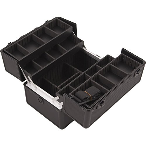 - Four extendable trays and adjustable dividers; removable shoulder strap