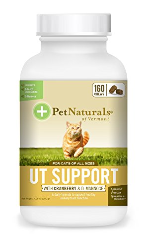 -. Binding : Misc. -. Brand : Pet Naturals -. EAN : 0026664010773 -. Feature : UT support is a daily supplement that contains 4 active ingredients that promote proper urinary tract function and may reduce the likelihood of crystal formation that causes discomfort among cats. / Pet Natural's UT support provides added nutrients that help maintain normal pH Balance in the urine of cats that are prone to UT infections. / Each bottle of our UT support formula includes 160 chicken liver flavored soft chews that even the most finicky cats will love. / UT is a daily supplement to support the feline urinary tract system. It is recommended for cats that are prone to urinary tract health issues. / UT support from pet Natural's does not include wheat, corn or artificial ingredients. All pet Natural's of Vermont products are NASC approved and manufactured in the USA. -. Label : Vetri-Science Laboratories -. Manufacturer : Vetri-Science Laboratories -. Model : 070054G.160 -. MPN : 070054G.160 -. PackageQuantity : 1 -. PartNumber : 070054G.160 -. ProductGroup : Pet Products -. ProductTypeName : PET_SUPPLIES -. Publisher : Vetri-Science Laboratories -. Studio : Vetri-Science Laboratories -. Title : Pet Naturals of Vermont UT Support for Cats, Urinary Tract Supplement, 160 Bite Sized Soft Chews -. UPC : 026664010773