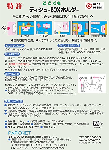 -. Feature : サイズ:137×55×39mm / 本体重量:25g / 素材・材質:ABS(アクリロニトリル・ブタジエン・スチレン)樹脂、両面テープ/ポリエチレン基材・ゴム系粘着剤 / 原産国:日本 / 耐荷重:1kg / 付属品:両面テープ(貼付済)