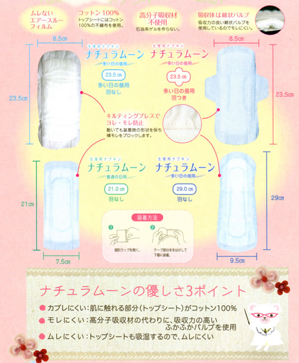 내추럴 문 시리즈의 냅킨은, 환경에의 부하가 적다고 하는 과 탄소 나트륨에 의한 산소 표백을 채용하고 있습니다.